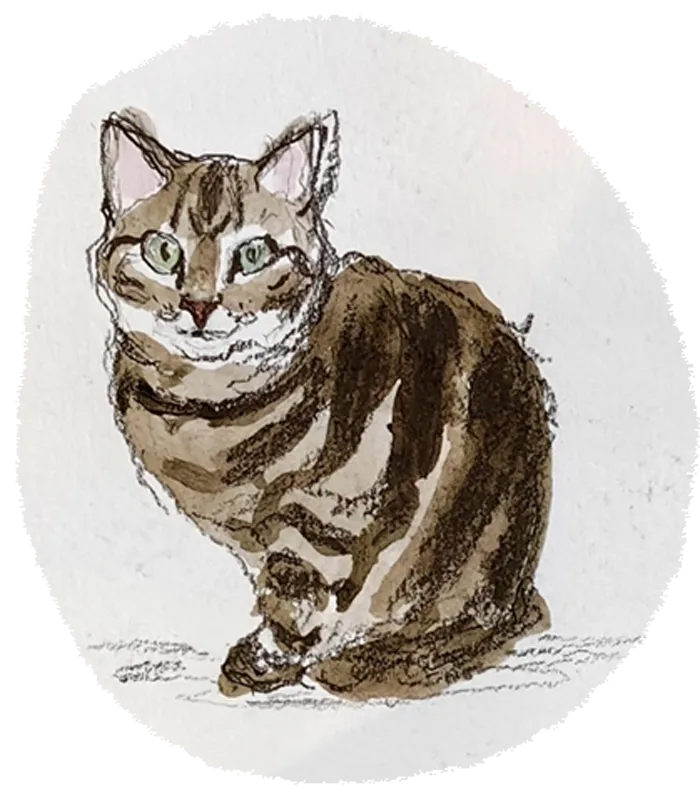 Houdini is a striped tabby who is mostly Grandpa’s cat. He is the family’s official chipmunk chaser. He keeps one eye open for them when he is napping on the deck.